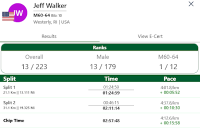 Post-race, I received a lot of supportive comments through texts and Strava.  The perspective was helpful, and in retrospect a 2:57 marathon at age 59 isn't that bad.  Matthew told me it equated to a 2:26 age-graded.  While I can't call it a well run race, as I dropped a full minute in pace time from 6:20s to 7:20s, it could have been much worse.